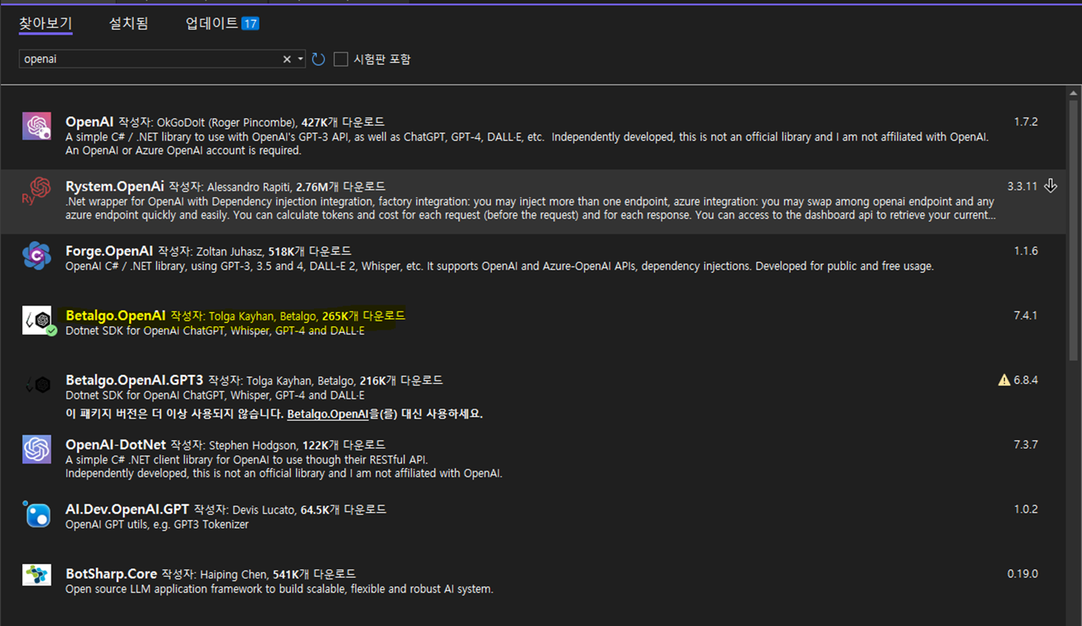 저는 Betalgo.OpenAI를 설치하였는데, 다른 라이브러리를 쓰셔도 무방할 듯 합니다.