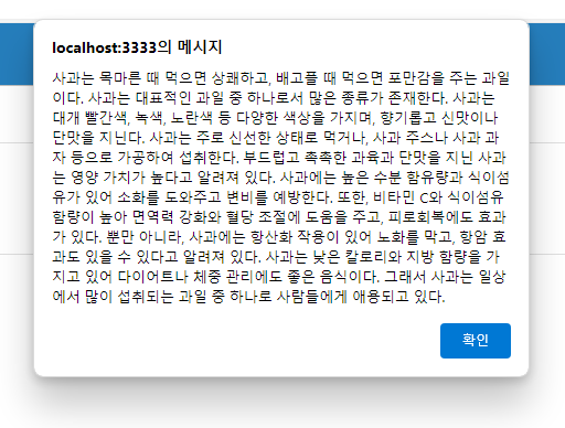 결과를 alert로 띄우는 것도 가능합니다. ('사과' 라고 검색한 결과)
