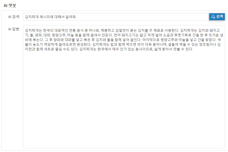 "김치찌개 레시피에 대해서 알려줘" 라고 입력하고 검색 버튼을 누르면,