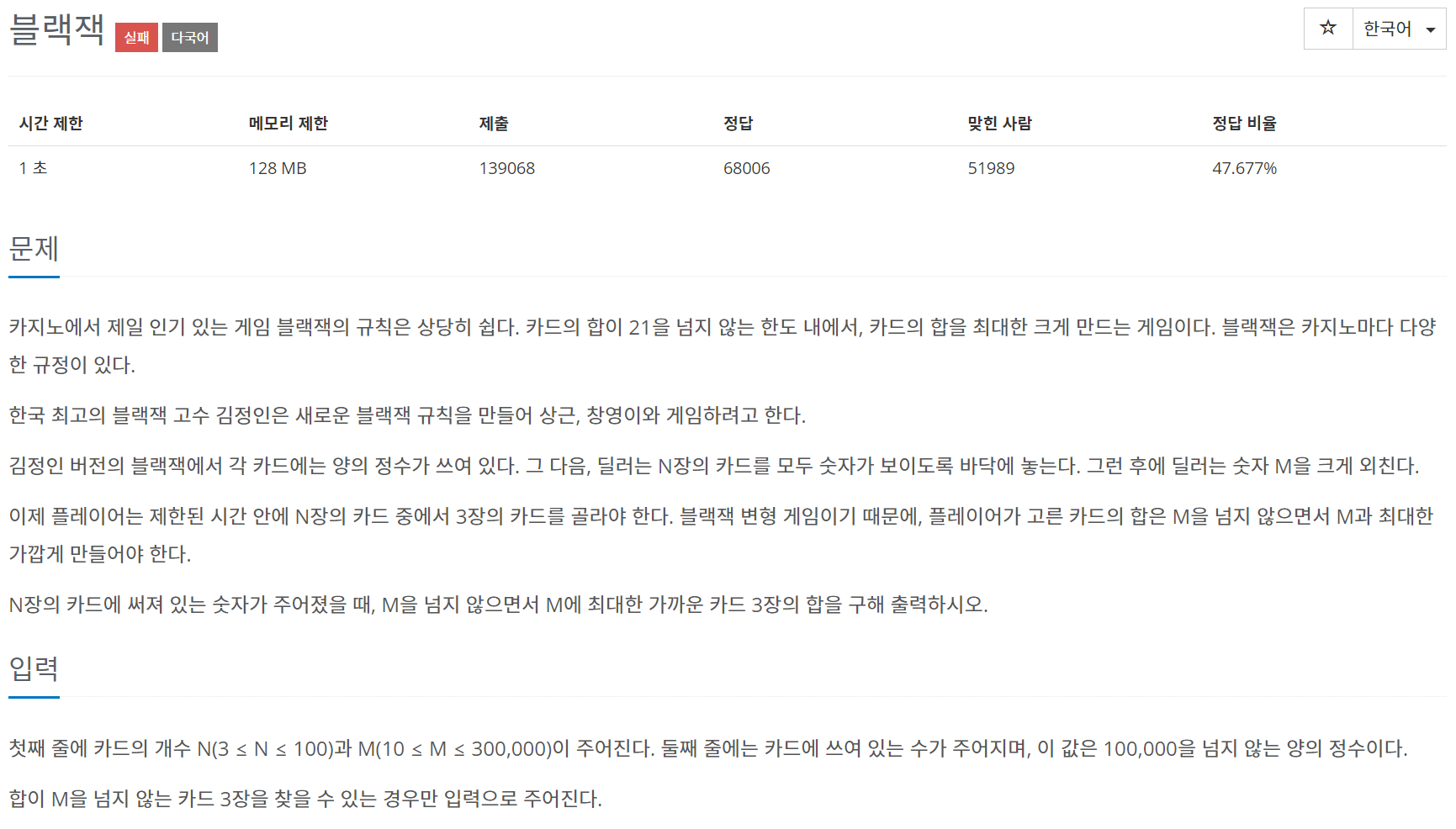 # 3개의 카드를 고르는 모든 경우의 수에 대해 합을 구하고 최댓값을 갱신
