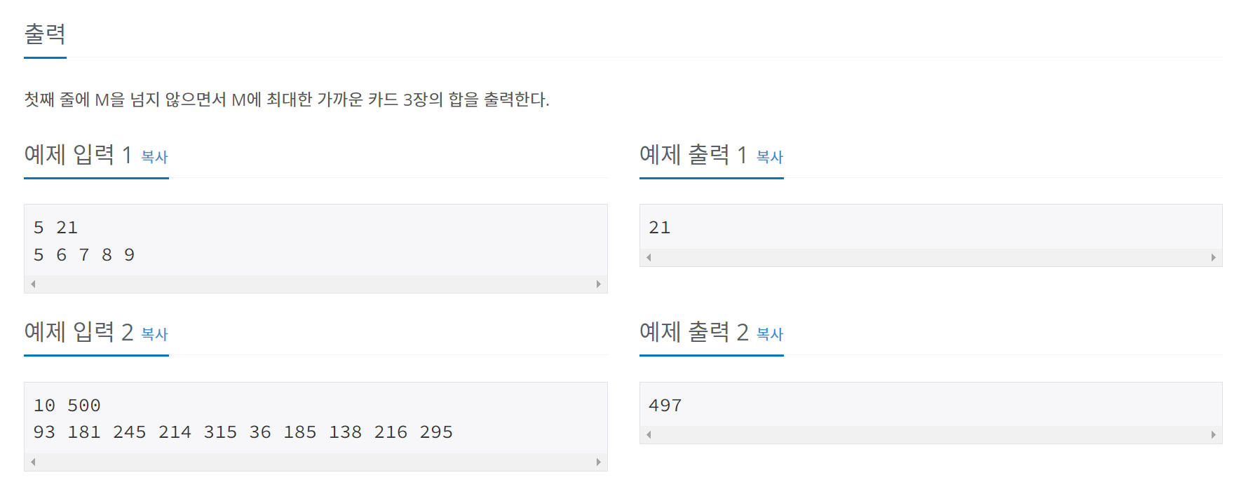 # 3개의 카드를 고르는 모든 경우의 수에 대해 합을 구하고 최댓값을 갱신
