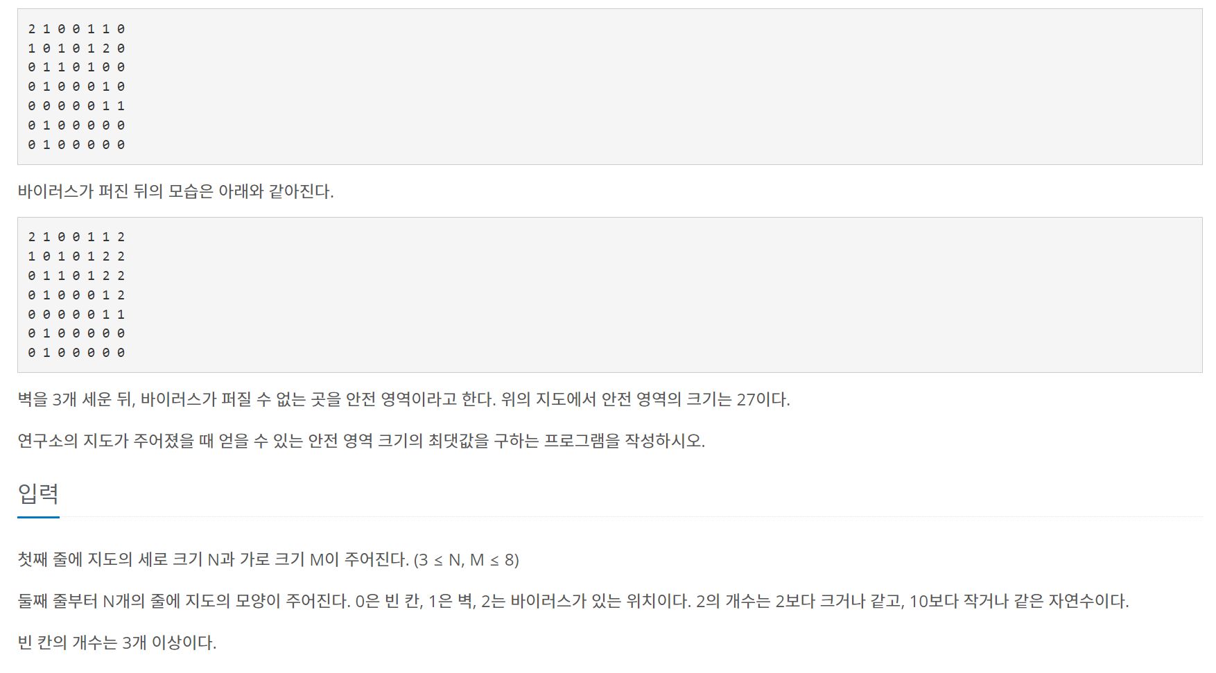# 빈 칸의 좌표와 바이러스의 좌표를 구합니다.