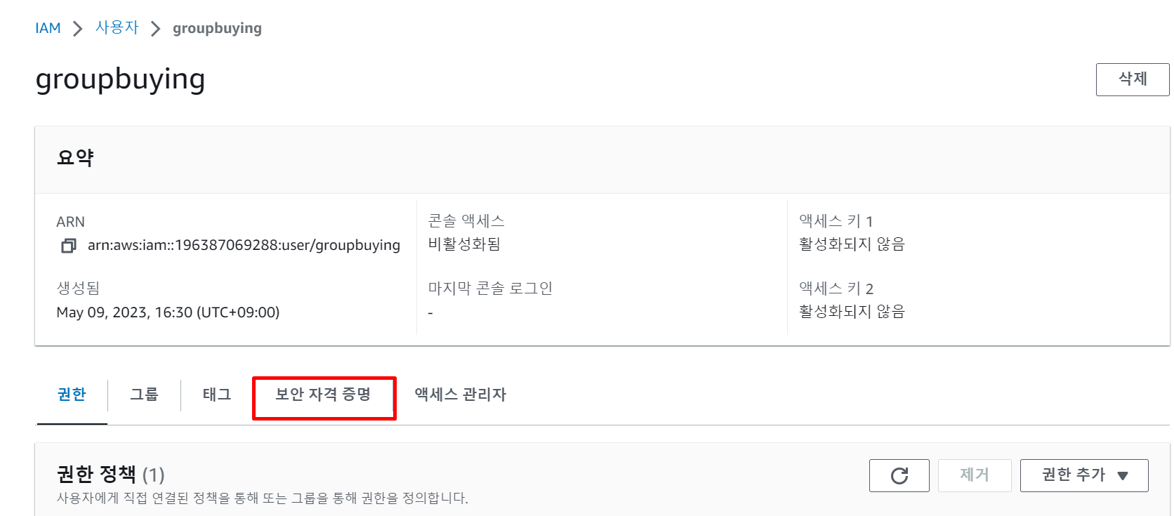 만들어진 사용자에서 보안 자격 증명 클릭.