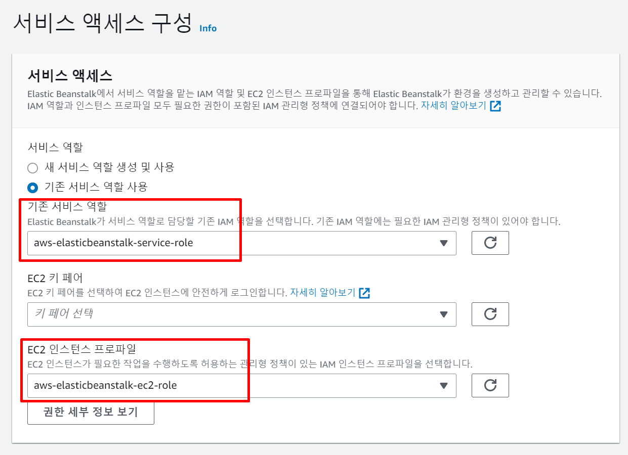 기존 서비스 역할과 EC2 인스턴스 프로파일은 없다면 만들어 주어야 한다.