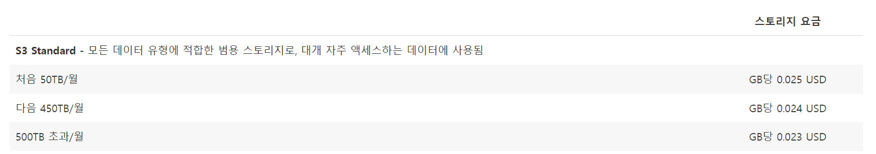 가장 일반적인 S3 Standard의 경우, 요금은 아래와 같다.