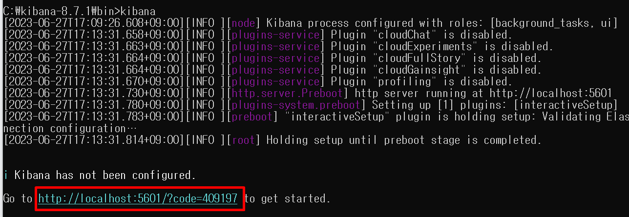 설치 중이다. 처음이면 kibana가 설정이 되지 않았다고 뜬다.