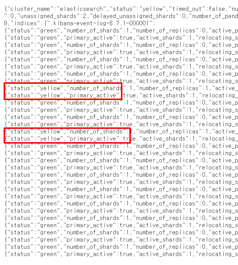 "yellow" 상태는 일부 혹은 모든 인덱스의 복제 샤드가 정상적으로 작동하지 않는 상태를 말한다.